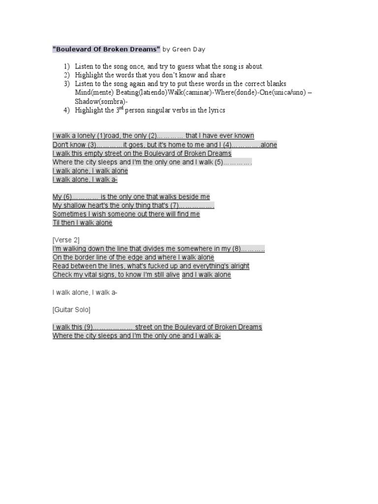 Song Worksheet Boulevard Of Broken Dreams By Greenday Esl Worksheet By Petrigma